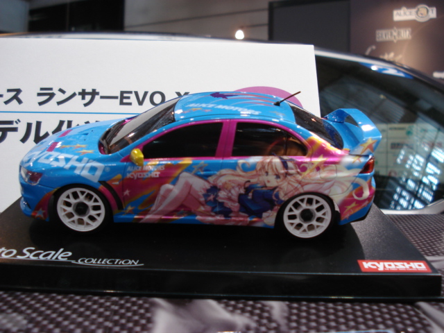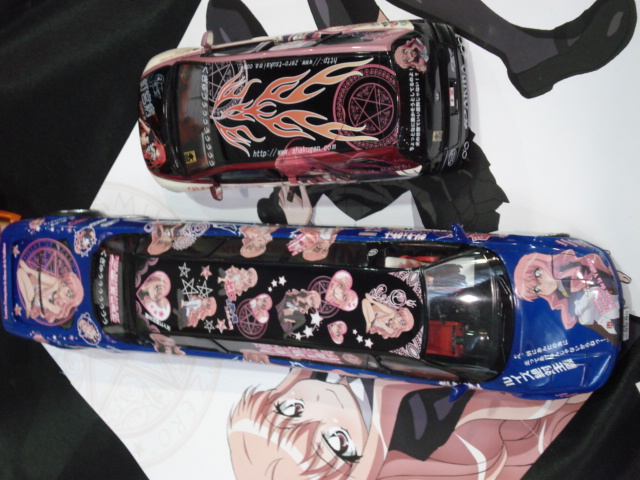 初日レポートの「まずは画像でざっくりと」にも一部画像が映っていましたが、京商さんにアリスソフト痛車が展示されていました。黒カラーは練習用で、水色は本番用カラー。
