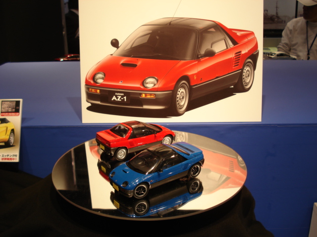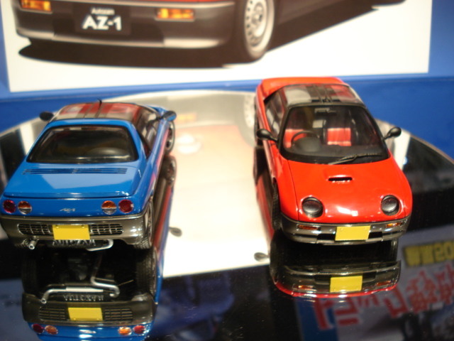 5月発売1/24 ザ・ベストカーGT No.63 コペン エッチング付 プラモデル、7月発売の1/24 ザ・ベストカーGT No.42 オートザムAZ-1 プラモデル(RA)の写真も何枚か撮ってきました。赤と青ではホイールも違います。